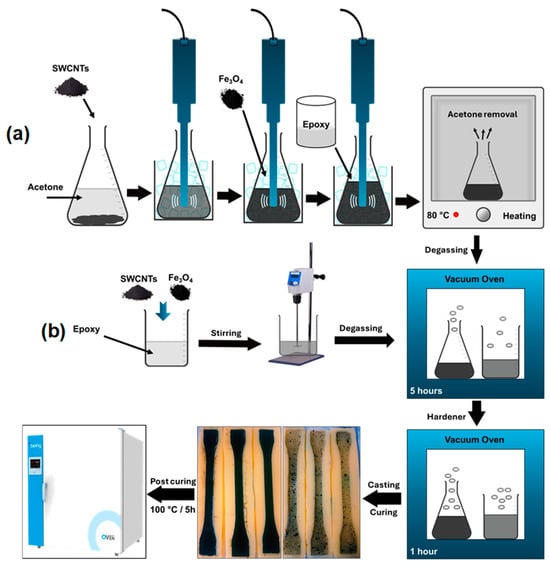 The fabrication of CNT/Fe3O4/epoxy hybrid composites was performed using probe sonication and mechanical stirring to investigate the effectiveness of uniform dispersion on mechanical properties. The composites were prepared with different weight percentages, i.e., (0.1, 0.3, and 0.5 wt.%) of the CNT/Fe3O4 hybrid filler, and three samples were prepared for each weight percentage for both methods. Figure 1 shows the complete schematic process of preparation.
