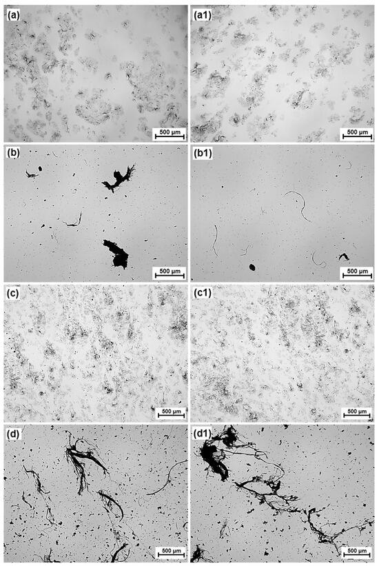 This study was meant to disperse CNT/Fe3O4/epoxy composites by two distinct approaches, i.e., sonication and stirring, and carry out performance evaluation of the composites. To better observe and compare the dispersion quality between the two fabrication techniques with a gradually increasing content of CNT/Fe3O4, the composite was observed from time to time using an optical microscope. Microscopic observations indicated that the dispersion quality was much improved with a homogeneously dispersed CNT/Fe3O4 throughout the epoxy matrix by the sonication method, while at the same time, the composite solution prepared by the stirring method showed poor dispersion with noticeable agglomerations of CNTs. The employed dispersion time was adjusted by varying the weight percentages of CNT/Fe3O4. However, with increasing filler loading, the disparity in dispersion quality between the sonication and stirring techniques became more evident. The microscopic analysis provided valuable insights and exposed clear differences in the dispersion quality of the composites based on the fabrication method employed. Figure 2 shows the microscopic images captured during the observation of the dispersion features with an escalating filler weight percentage (wt.%). Figure 2 represents the dispersion results of the CNT/Fe3O4/epoxy composites that were (a, a1) 0.1 wt.% sonicated, (b, b1) 0.1 wt.% stirred, (c, c1) 0.3 wt.% sonicated, (d, d1) 0.3 wt.% stirred, (e, e1) 0.5 wt.% sonicated, and (f, f1) 0.5 wt.% stirred. It can be perceived that even at higher filler loadings the dispersion phenomena are more prominent with the sonication method, while the presence of huge clusters and agglomerations of CNTs evident bad dispersion in the composites prepared by the stirring method. Overall, the visual observations underscored valuable information on the morphology and structural integrity of the manufactured composite materials.