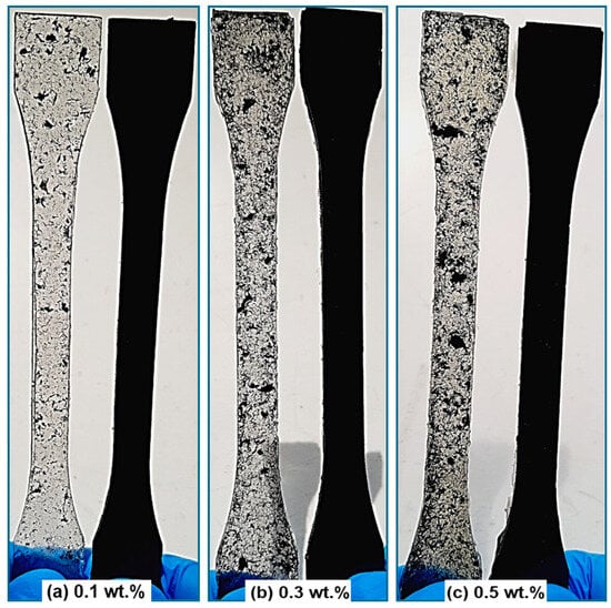 A Zeiss AxioVert.A1 optical microscope (Carl Zeiss Microscopy GmbH, Jena, Germany) was used to observe the dispersion quality of the composite solution. The mechanical properties of the composite were analyzed using a Zwick-Roell Z010 universal testing machine (ZwickRoell GmbH & Co. KG, Ulm, Germany) at room temperature, with a load cell of 10 kN, 50 mm gauge length, and 5 mm/min crosshead speed. The obtained stress–strain curves were used to calculate the elastic modulus, ultimate tensile strength (UTS), and strain at rupture.