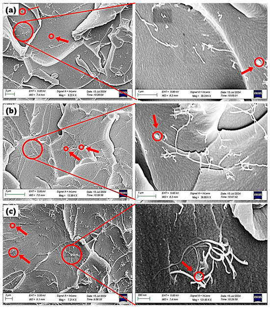 The addition of Fe3O4 was intended to improve the dispersion of the CNTs. To further explore this, the sonicated composite samples were analyzed using Scanning Electron Microscopy (SEM) to visualize the dispersion and interaction of the components within the composite. It was observed that the presence of Fe2O3 particles facilitated the breaking up of nanotube bundles, promoting a more even distribution within the epoxy matrix []. Figure 4 presents the SEM images of the composite materials, divided into three sections, (a), (b), and (c), representing the composites with 0.1 wt.%, 0.3 wt.%, and 0.5 wt.% CNTs, respectively. In Figure 4a, the SEM image of the composite with 0.1 wt.% CNTs is shown. The inset image provides a higher-resolution view, indicating the presence of Fe3O4 particles (highlighted by arrows) and their interaction with the CNTs. Due to the lower amount of CNTs, there are insufficient nanotubes to form a network structure, although their presence is evident in the inset image. This interaction suggests that Fe3O4 particles achieve a more uniform distribution of CNTs within the epoxy matrix. Moving to Figure 4b, the SEM image corresponds to the composite with 0.3 wt.% CNTs. The inset image reveals a more homogeneous structure with well-dispersed CNTs forming interconnected pathways. The arrows point to the Fe3O4 particles, which are crucial in facilitating the improved dispersion of CNTs. The fully dispersed CNTs create significant interconnected pathways, notably enhancing the composite’s mechanical, electrical, and thermal properties []. Lastly, Figure 4c shows the SEM image of the composite with 0.5 wt.% CNTs. The inset image highlights the dense networks of CNTs, with the arrows indicating the presence of Fe3O4 particles. However, at this higher concentration, the dispersion of the CNTs is not as effective, leading to noticeable agglomeration of the nanotubes. This agglomeration adversely affects the mechanical properties compared to the composite with 0.3 wt.% CNTs.