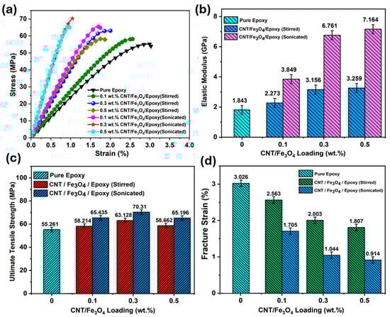 Comparative results for tensile properties of pure epoxy and CNT/Fe3O4 epoxy composites prepared by two different stirring and sonication methods at various filler loadings: (a) stress–strain curves, (b) elastic modulus, (c) ultimate tensile strength, and (d) fracture strain.
