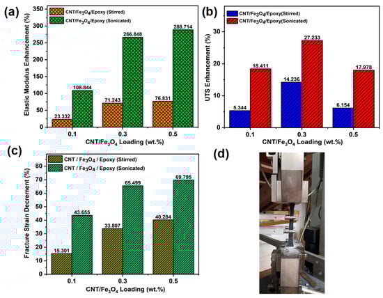 Comparison of CNT/Fe3O4 epoxy composites with increasing filler loading to pure epoxy for (a) elastic modulus enhancement (%), (b) ultimate tensile stress (UTS) enhancement (%), (c) fractural strain decrement (%), and (d) tensile testing setup.