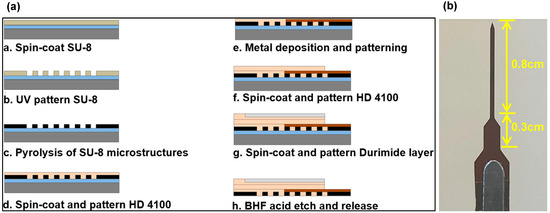 A 1.6 cm long penetrating neural probe with four GC microelectrodes of 30 μm × 60 μm size was microfabricated. As described elsewhere, the microfabrication process for the probe shown in Figure 1a involved spin coating of SU-8 negative photoresist (Microchem, Boston, MA, USA) on a silicon wafer (with 0.5 μm thick oxide layer) at 1200 rpm for 55 s and soft baking at 65 °C for 10 min and 95 °C for 20 min, followed by UV exposure at ~400 mJ/cm2 [52]. This was followed by a post-exposure bake at 65 °C for 1 min and 95 °C for 5 min, development of SU-8 for 3–5 min, and curing at 150 °C for 30 min. Pyrolysis was carried out at 1000 °C in an inert N2 environment following protocols described elsewhere [52,53,54]. Subsequently, 5 µm layer of photo-patternable polyimide (HD 4100) (HD Microsystems, Wilmington, DE, USA) was spin-coated on top of the GC microelectrodes at 2500 rpm for 45 s, soft-baked at 90 °C for 3 min and at 120 °C for 3 min, then cooled down to room temperature, and patterned through UV exposure at ~400 mJ/cm2. Then, the polyimide layer was partially cured at 300 °C for 60 min under N2 environment. Following, Pt metal traces with Ti adhesion layer were patterned using a metal lift-off process. For electrical insulation, an additional 6 µm of polyimide HD 4100 was spin-coated (300 rpm), patterned (400 mJ/cm2), and cured (350 °C for 90 min) under N2 environment. An additional 30 µm thick layer of polyimide (Durimide 7520, Fuji Film, Tokyo, Japan) was spin-coated (800 rpm, 45 s) and then patterned (400 mJ/cm2) on top of the insulation layer to reinforce the penetrating portion of the device (Figure 1b). Once the probes were released from the carrier substrate using a BHF bath, the GC microelectrodes were plasma-etched (120 W for 45 s) and then functionalized through drop casting of an enzyme mix’s thin coat.