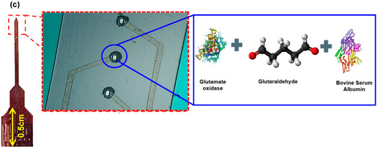 As shown in Figure 1c, the surface functionalization process consisted of preparing an enzyme immobilization matrix made of glutamate oxidase (GluOx), a catalytic enzyme, glutaraldehyde (a reagent from the aldehyde family that allows a rapid ionic immobilization of the enzyme on the GC microelectrode surface), and bovine serum albumin (BSA) which provides stability to the enzyme and the reagent mixture. L-glutamic acid (≥99%), L-glutamate oxidase (from Streptomyces sp.), and bovine serum albumin (≥96%) were purchased from Sigma Aldrich (St. Louis, MO, USA). In addition, glutaraldehyde (25% solution distillation purified) was purchased from Electron Microscopy Sciences (Hatfield, PA, USA). Before mixing, GluOx, glutaraldehyde, and BSA were brought to room temperature. Then, the GluOx enzyme was dissolved in 1 μL of DI water. Separately, 0.01 g of BSA was placed in a microcentrifuge tube and 985 μL of DI water was added to it. The mix was then vortexed at low rpm. Subsequently, 5 μL of glutaraldehyde was added. This mixture of BSA/glutaraldehyde was then transferred into a 500 μL microcentrifuge tube, 1 μL of GluOx was added to it, and it was vortexed again at slow rpm. This was followed by dry storage of the immobilization matrix at room temperature to ensure a successful crosslinking between the enzyme, glutaraldehyde, and BSA. Finally, 10 μL of the immobilization matrix was then extracted and pipetted for drop casting of a thin coat over the surface of the GC microelectrodes.