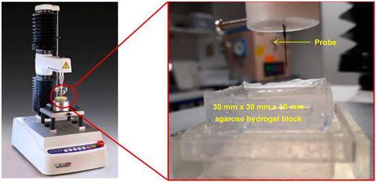 The mechanical stability of the probes and their penetration ability were tested using a TA.XT plusC Texture Analyzer (TA) (Stable Micro Systems Products, Hamilton, MA, USA). To determine an appropriate agarose gel concentration that models the modulus of brain tissue, a compression calibration test was first carried out as explained in the accompanying Supplementary Document (Section S1) [55,56,57,58]. Once the relevant concentration of agarose gel was determined, penetration tests of the in vitro model medium were carried out using the GC probes presented in Figure 1. For this, a holder for the GC probe was designed, 3D-printed, and mounted on the probe of the TA (Figure 2). The agarose gel block shown in Figure 2 had a length of 30 mm, width of 30 mm, thickness of 10 mm, and area of 900 mm2. The same speed of loading of 2 mm/s was used for the penetration test as well, with a 0.5 kg weight load cell.