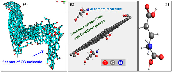 (a) GC molecule [58]; (b) MD model consisting of only 6-membered carbon rings with functional groups (carbonyl, carboxyl, hydroxyl, and epoxy) and glutamate molecules in a simulation cell of 25 Å × 25 Å × 25 Å; (c) single glutamate (C5H9NO4) molecule which is considered to represent an active site of GluOx in this study.