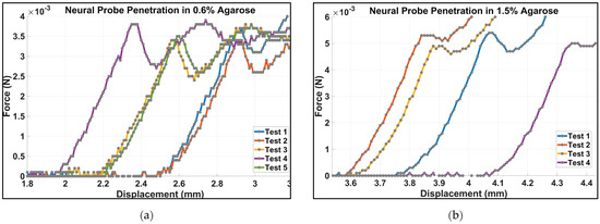 Figure 4 shows the force–displacement plots for the penetration force test of the neural probe for the agarose hydrogel of a 0.6% concentration, which was found to be a good model for brain tissue (Section S2). The first clearly identifiable peak shown in Figure 4 corresponds to the first section of the neural probe penetrating the surface of the gel. The penetration force is then identified as the first maximum of the force–displacement curve. The force needed to penetrate the 0.6% agarose hydrogel simulating the brain tissue was 0.0035 ± 0.00015 N (n = 5); for the 1.5% agarose hydrogel, the penetration force was 0.0051 ± 0.00028 N (n = 4).