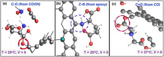 We explored the interaction of the functional groups (COOH, CO, OH, and O) on the carbon microelectrode material with glutamate and the immobilized enzyme mix. For this, we considered the effect of electrical bias (0 V, 0.4 V), temperature (25 °C and 37 °C), type of functional groups, number of molecules of glutamate, and the lattice of the 6-member carbon ring group on this interaction. Several potential interactions with functional groups to produce covalent bonds were explored. As shown in Figure 5a, the carboxyl (COOH) functional group was observed to interact with glutamate at a temperature of 25 °C with no electrical bias, with the glutamate molecule forming a carbon–oxygen (C-O) covalent bond with the functionalized GC microelectrode surface. This interaction occurred due to the donation of electrons by glutamate. The epoxide group was observed to facilitate the formation of a strong carbon–nitrogen (C-N) covalent bond between the nitrogen molecule from glutamate and the carbon molecule of the microelectrode (Figure 5b). However, at this temperature and 0 voltage bias, no interactions were observed for the carbonyl (CO) and hydroxyl (OH) functional groups. Considering a slightly higher temperature of 37 °C, the carbonyl functional group (CO) resulted in a C=O covalent bond (Figure 5c).
