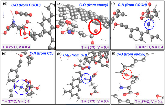 (a) C-O bond due to COOH group at 25 °C and no bias; (b) C-O bond due to epoxy group at 25 °C and no bias; (c) C=O bond due to carbonyl group at 37 °C and no bias; (d) C-O bond due to COOH group at 0.4 V and 25 °C; (e) C-O bond due to epoxy at 0.4 V and 25 °C; (f) C-N bond due to COOH group at 0.4 V and 37 °C; (g) C-N bond due to CO group at 0.4 V and 37 °C; (h) C-N bond due to OH group at 0.4 V and 37 °C; (i) C-O bond due to epoxy at 0.4 V and 37 °C.