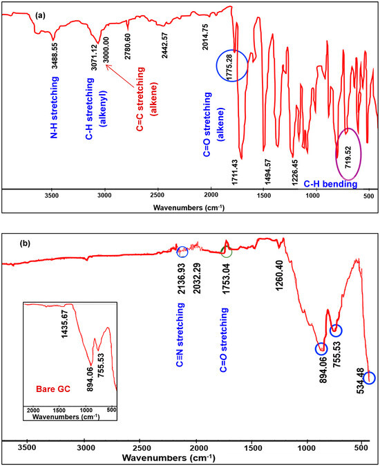 For the bare GC control specimen (inset in Figure 6a), three clear and distinct peaks that ranged between 1435.67 cm−1 and 755.53 cm−1 were detected, representing a C-O stretch with a single bond [63]. The second sample had its bare GC surface plasma-etched at 120 W for 45 s before coating it with the glutamate oxidase mixture. Figure 6a summarizes several peaks for the glutamate oxidase sample on top of GC: the first peak at 3488.55 cm−1 corresponds to the amine stretch (N-H) that potentially originated from unreacted amino groups in glutamate oxidase and L-glutamate [64], while the peak at 3071.12 cm−1 corresponds to the alkenyl (C-H) stretch and its neighbor peak of 3000 cm−1 corresponds to unsaturated alkene (C=C) compounds. Carboxylic acid (C=O) peaks are represented by a stretch in the region of 1775.28 cm−1–719.52 cm−1 while (C-H) bending vibration with single or multiple absorption bands is represented by 719.52 cm−1 [65]. For the third sample that was coated with glutamate oxidase, more peaks were detected, as shown in Figure 6b, where the characteristic absorption ranged between 2136.93 cm−1 and 534.48 cm−1. The highest fingerprint was 2136.9 cm−1, which is a triple bond between the carbon and nitrogen stretch (C≡N), and the second peak was 1753.04 cm−1, which corresponds to an aldehyde C=O stretch; this one, in particular, was derived from the glutaraldehyde present on the surface of the microelectrode from the enzyme mixture [66].