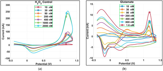 (a) Redox peaks in FSCV for detection of H2O2 of varying concentrations used as control experiment (10 nM–2 μM). (b) Redox peaks in FSCV during indirect glutamate detection for 10 nM–1.6 μM concentrations.