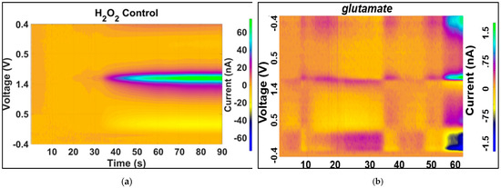 (a) Two-dimensional false-color plot corresponding to addition of 200 nM concentration of H2O2; (b) two-dimensional false-color plot corresponding to addition of 10 nM concentration of glutamate to PBS solution.