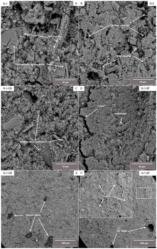 Figure 1) and the promoted granular C-S-H shape compared to the C-S-H needles present in samples G-1 and G-2. Similar conclusions can be drawn for the microstructure of sample G-1-CB. Even though the added carbon black is assumed to be chemically inert, it might physically block the free water-filled space, preventing the growth of a needle-like C-S-H microstructure and reducing porosity.