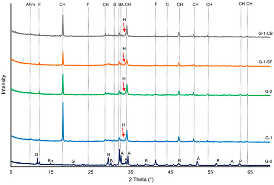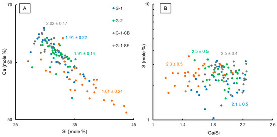 Figure 4A) showed that the Ca/Si ratio of the C-S-H matrix decreased due to the addition of silica fume and increased slightly in sample G-1-CB. Previous studies found that the Ca/Si ratio directly correlates with increased polymerization of the silicate chains, constituting the layers inside the nanometric units of C-S-H [