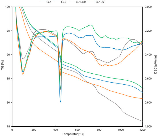 For STA, the dried sample slices of the cement sheaths were ground and milled using a hand mortar to obtain an analytically fine powder. Between all sample preparation steps and the measurement, the samples were stored in a desiccator to prevent carbonation of the samples. A combined measurement of thermogravimetry (TG) and differential scanning calorimetry (DSC) was carried out using a TG-DSC Apparatus STA 449 C from Netzsch located at the Chair of Process Technology and Industrial Environmental Protection, Montanuniversität Leoben, Austria. TG is a method in which the change in mass of a material during progressive heating is recorded as a function of temperature. Changes in mass are a result of degradation, the removal of water (e.g., dehydration), and the oxidation of components within the material. DSC is a thermo-analytical technique in which the difference in the amount of heat required to increase the temperature of a sample is measured as a function of temperature, allowing for differentiation between exothermal and endothermal reactions recorded via TG. For hardened cement pastes, three major weight losses can be differentiated during an STA experiment [