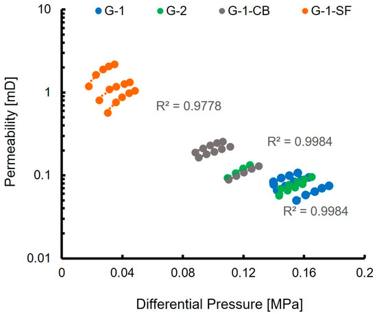 Table 4), the permeability was not tailored beneficially by these measures. But permeability is also dependent on the connectivity, shape, and tortuosity of the pores. Since porosity did decrease in samples G-1-CB and G-1-SF, the assumption can be drawn that matrix permeability for samples containing carbon black or silica fume did decrease. However, due to the higher brittleness and, therefore, the increased occurrence of fractures or heterogeneous distribution of the additive within the sample, higher bulk permeability was observed. Since lower porosity and especially lower pore sizes mean higher capillary forces, it is generally harder for fluids to permeate through the cement. However, future research focusing on permeability aspects within this context is necessary.