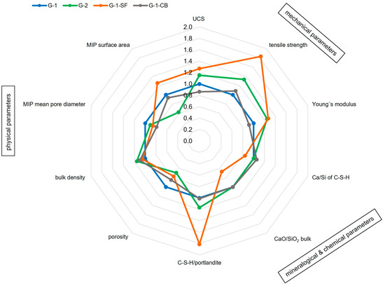 61] combined with high-resolution in-situ chemical analysis (e.g., FE-EPMA), could contribute to a more ultimate conclusion. Samples G-1 and G-2 show the same Ca/Si ratio; however, G-2 has elevated UCS. This can be explained by the decreased porosity of the sample due to the lower water content in the mix formulation.