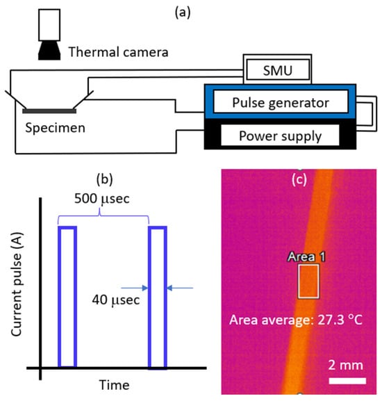 (a) Schematic diagram of the experimental setup. (b) Time vs. current graph of the electrical pulses. (c) Infrared image of a specimen during electron wind force annealing.