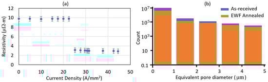 Monitoring of Electrical Resistance: The resistance of the samples was monitored using a 2-channel source measure unit (2636B, Keithley, Cleveland, OH, USA). The pre-annealing resistance was measured before the electropulsing treatment. Kelvin clips were used to perform 4-point probing to avoid the influence of any contact resistance. The current density was calculated by dividing a passed current by the cross-sectional area of the samples. The resistivity at each stage of current density was compared with the initial value, and the percentage changes were calculated.