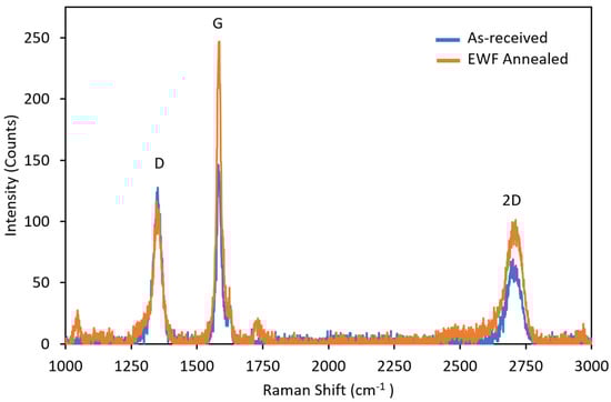 Average Raman spectra of NBG-18 as-received and electron wind force annealed at 28 °C temperature and 44.5 A/mm2.