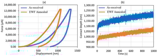 Nanoindentation tests on as-received NBG-18 nuclear graphite and annealed graphite at 28 °C temperature and 44.5 A/mm2. (a) Average force–displacement curves with 0.2 s hold time. (b) Collective displacement–time data for all the specimens with 1000 s hold time.