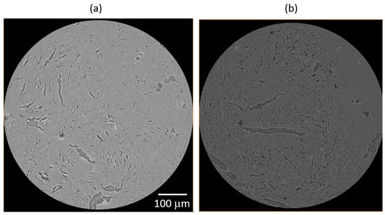 X-ray computed tomography scans of (a) as-received NBG-18 nuclear graphite and (b) annealed graphite at 28 °C temperature and 44.5 A/mm2.