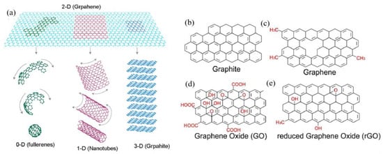(a) Carbon allotropes: graphene to fullerene, nanotubes and graphite. Reprinted with permission from reference [35]. Copyright 2007, Springer Nature. The molecular structure of (b) graphite, (c) graphene, (d) GO, and (e) rGO [36]. Copyright Taylor and Francis, 2022.