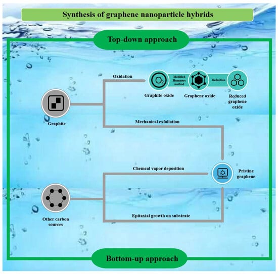 Figure 2 illustrates the two main methods of graphene synthesis: bottom-up and top-down methods [40]. Bottom-up methods involve the continuous growth of graphene through methods that break the chemical bonds of carbon-containing compounds and deposit carbon atoms on a substrate. Bottom-up methods include techniques such as chemical vapor deposition (CVD) [41] and epitaxial growth [42], which build graphene structures at the atomic or molecular level. In contrast, top-down methods are used to obtain graphene from bulk graphite by breaking the van der Waals forces between graphite layers with the help of external forces. Top-down methods include the reduction of graphene oxide via the Hummers method and the modified Hummers method to obtain reduced graphene oxide (rGO) [43]. There are also techniques such as ultrasonic exfoliation [44], ball-milling exfoliation [45], and electrochemical exfoliation [46]. In addition, there are techniques using graphene composites combined with nanoparticles (NPs), such as graphene encapsulation, graphene anchoring, and hybrid hybridization, through which sandwich structures and laminated hybrid NPs are prepared. For the analysis of their physicochemical properties, a variety of microscopic (e.g., scanning electron microscopy, transmission electron microscopy, atomic-force microscopy) and spectroscopic (e.g., X-ray photoelectron spectroscopy, X-ray absorption spectroscopy, Raman spectroscopy, Fourier transform infrared spectroscopy) techniques can be used [47]. Overall, the top-down preparation of graphene is inexpensive, simple, energy-efficient, and easy to scale up.