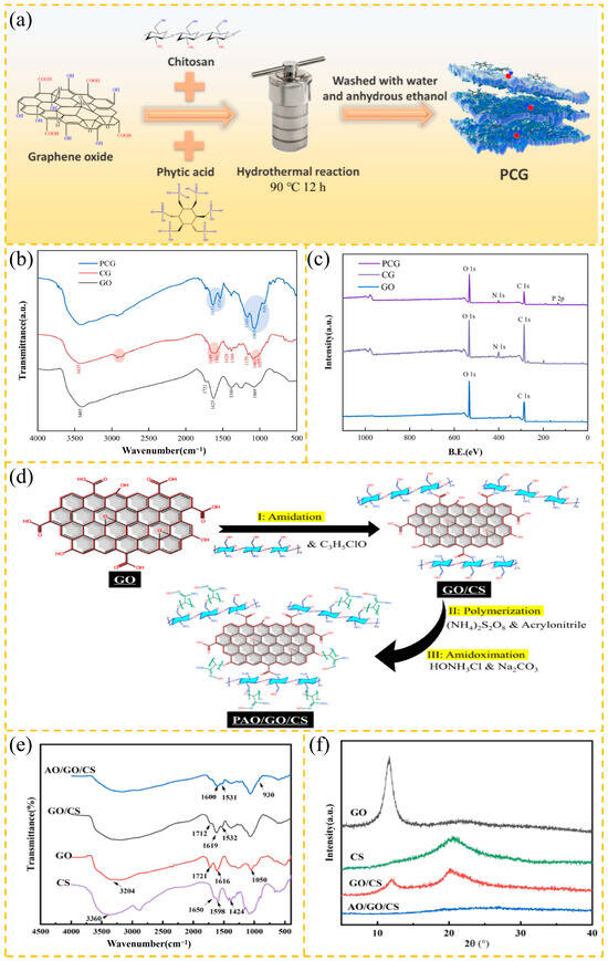 However, the CS/GO composites showed a low adsorption capacity and poor selectivity. Therefore, it seems necessary to graft specific functional groups on CS/GO composites (CGs) to enhance their adsorption performance for pollutants in wastewater. Xia et al. [69] used GO, CS, and phytic acid as raw materials to directly prepare a novel CS/GO composite containing phytic acid (PCG) though a hydrothermal reaction for the removal of uranium (VI) from an aqueous solution where the phytic-acid-containing CS/GO composite was prepared as shown in Figure 4a. The FTIR and XPS survey spectra of GO, CG, and PCG are shown in Figure 4b,c, demonstrating the successful synthesis of PCG. The results showed that the PCG produced via chemical bonding of the hydroxyl group in the phytic acid molecule with the amino group in CS had a porous structure with a lamellar surface, good thermal stability, and chelating ability for uranium (VI). Zhou et al. [6] prepared a novel composite polyamide oxime/GO/CS composite (PAO/GO/CS) though crosslinking and in situ polymerization, and the synthesis route is shown in Figure 4d. The FTIR and XRD analysis of PAO/GO/CS and its precursor composites before adsorption of U(VI) are shown in Figure 4e,f. This indicates that the amidoxime groups were successfully grafted onto the surface of GO/CS. The resulting defects in uranium (VI) adsorption could be compensated by grafting amidoxime on the surface of GO/CS. According to the characterization and density-functional theory (DFT), uranium (VI) was spontaneously adsorbed onto the oxygen-containing groups in PAO/GO/CS mainly though chemisorption. Zhang et al. [70] prepared a GO suspension by using the improved Hummers method combined with ultrasonic dispersion technology, and then they successfully synthesized a new material, GEC, through covalent binding and electrostatic interaction with CS and EDTA-2Na.
