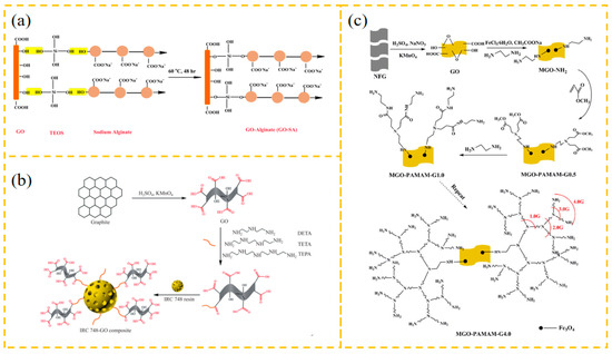 (a) Preparation of GO–SA adsorbent [71]. Copyright 2016, Springer Nature. (b) Synthesis of IRC748–GO composite. Reprinted with permission from reference [72]. Copyright 2024, Springer Nature. (c) Synthesis process of MGO-PAMAM. Reprinted with permission from reference [75]. Copyright 2024, Elsevier.