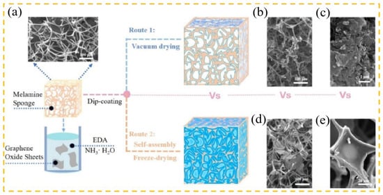 (a) Synthetic route and SEM images of melamine sponge. (b,c) SEM images of graphene sponge at low magnification and high magnification. (d,e) SEM images of AFGS at low magnification and high magnification. Reprinted with permission from reference [87]. Copyright 2021, Elsevier.
