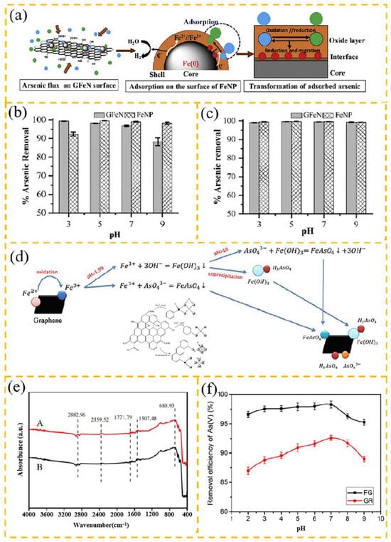 Various treatment techniques for arsenic removal have been investigated. These include physicochemical processes such as adsorption [103], precipitation [104], and membrane separation [105]. Among them, adsorption is considered an economical and simple operational technique for arsenic remediation. Various materials can be used as possible adsorbents for the removal of arsenic. Although commercial activated carbon has been used for As(V) adsorption, its adsorption capacity is low, reaching a maximum of only 4.96 mg·g−1 at pH 7 and 25 °C [106]. Elsewhere, GO has received attention as a potential adsorbent for arsenic removal. The presence of functional groups such as hydroxyl, carboxyl, and epoxy groups promotes the adsorption of arsenic on the GO surface. However, the use of GO faces certain challenges, such as self-agglomeration and difficulties in the post-processing separation of nanoparticles [107]. Therefore, GO has been modified with different materials to improve its performance. Meanwhile, iron-oxide-derived adsorbents have received great attention in arsenic removal due to their excellent arsenic adsorption properties compared to other types of adsorbents [108]. Das et al. [61] used the inorganic composite material GFeN for the adsorption of As(III) and As(V) with very high adsorption capacities of 306.10 ± 9.92 mg·g−1 and 431.41 ± 25.95 mg·g−1, respectively. These findings highlight the great potential of GFeN as a highly efficient arsenic removal material. Figure 8a illustrates the potential mechanism of arsenic removal by GFeN. Initially, arsenic ions in water make contact with the nanohybrid surface, forming an arsenic flux gradient between the solution and the adsorbent surface. Subsequently, electrostatic adsorption and surface complexation result in arsenic adsorption onto the GFeN surface. Furthermore, the arsenic absorbed on the GFeN surface is transformed and stabilized in the nanohybrid material. Figure 8b,c also illustrates that the arsenic removal from GFeN is not controlled by electrostatic forces alone; instead, surface complexation plays an important role, making it effective over a wide pH range. Qu et al. [109] investigated the adsorption removal performance of As(V) from simulated arsenic-containing wastewater using iron nitrate–graphene (FG) nanocomposites. The adsorption data demonstrated that, under optimal conditions, the removal efficiency of As(V) was as high as 99%, with the treated arsenic content reduced to a remarkably low level of 9.4 μg·L−1. As shown in Figure 8d,e, the main mechanism for the removal of As(V) from water by graphene involves the interaction of arsenic ions with carboxyl, hydroxyl, and other oxygen-containing functional groups on the graphene surface. In addition, electrostatic adsorption, ion exchange and complexation also contribute to this process. These surface hydroxyl groups enhance the electron density on the graphene surface, making it charged and forming hydrogen bonds with hydrated As(III) and As(V) ions. In an aqueous environment, these ions are held together by charge attraction and hydrogen bonding. As(V) removal maintained above 95% under both acidic and alkaline conditions, as shown in Figure 8f.