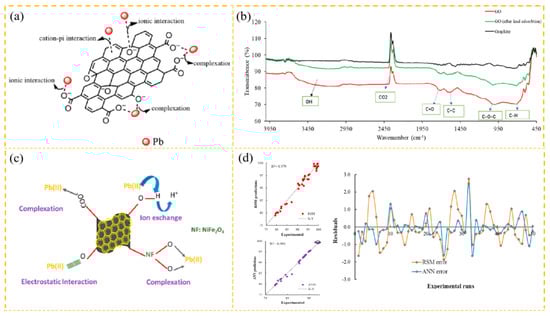 (a) The possible adsorption mechanism of Pb(II) on the GO surface from an aqueous solution. (b) FTIR spectrum of graphite powder, GO, and lead-adsorbed GO. Reprinted with permission from reference [127]. Copyright 2022, Elsevier. (c) Schematic representation of predominant mechanism for adsorption removal of Pb(II) with rGNF. (d) Comparison of performance of RSM and ANN predictions. Reprinted with permission from reference [124]. Copyright 2022, Elsevier.