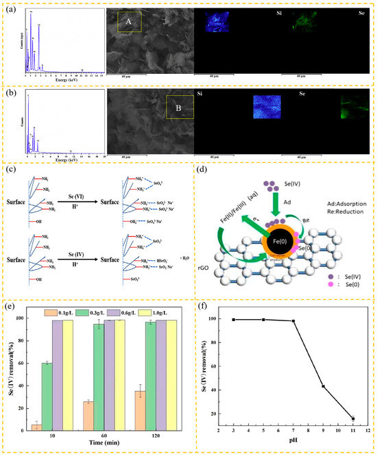 EDS spectra of PAMAM-GO after the adsorption of (a) selenate and (b) selenite ions. The scanned results of Si and Se in the yellow boxes (A and B) are shown on the right sides. (c) Schematic illustration of adsorption mechanisms for Se(IV) and Se(VI) on PAMAM-GO. Reprinted with permission from reference [139]. Copyright 2016, Elsevier. (d) Mechanism diagram of Se(IV) removal by nZVI/rGO. Influence of Se(IV) removal efficiency by nZVI/rGO: (e) contact time and dosage; (f) pH. Reprinted with permission from reference [141]. Copyright 2022, Springer Nature.