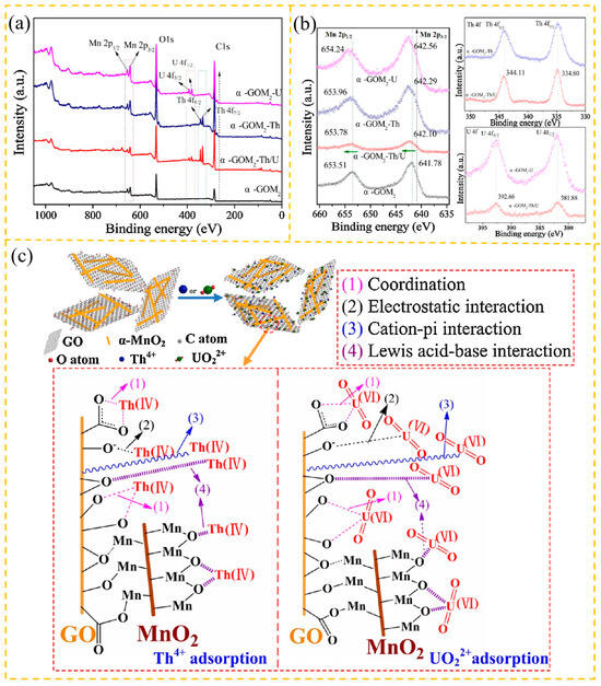 (a) XPS survey spectra and (b) Mn 2p, Th 4f, and U 4f peaks in the XPS spectra of α–GOM2 before and after adsorbing single Th(IV), single U(VI), and Th(IV)/U(VI). The green arrows indicate the increase in Mn 2p binding energy of α–GOM2 upon adsorption of Th(IV) or U(VI). (c) Schematic diagram of possible interaction between Th(IV) or U(VI) and α–GOM2. The yellow arrow and the dotted line box indicate the possible interaction mechanisms in the adsorption of Th(IV) or U(VI) by α–GOM2. Reprinted with permission from reference [63]. Copyright 2016, Elsevier.