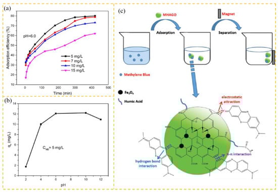 GO can also be composited with other polymeric materials such as sodium alginate, resins, polyethyleneimine, and polyamide dendritic polymers. Abd-Elhamid et al. [71] studied a new strategy for modifying GO with sodium alginate (SA) using ethyl orthosilicate (TEOS) as a binding agent. The GO–sodium alginate composites contained a high number of carboxylate (–COO–Na+) groups, which can interact with metal ions quickly and efficiently. The preparation of GO–SA is shown in Figure 5a. Ma et al. [72] utilized Amberlite IRC748 resin to modify GO to prepare a multifunctional composite adsorbent (IRC748–GO), and the mode of IRC748–GO synthesis is shown in Figure 5b. Arshad et al. [73], meanwhile, synthesized a composite of polyethyleneimine and GO, which showed an excellent adsorption capacity and stability for heavy metal ions such as Pb(II), Hg(II), and Cd(II) in an aqueous solution. Peer et al. [74] prepared a magnetic GO–polyamide dendrimer (mGO–PAMAM) composite by using a “grafting” strategy and investigated its adsorption behavior on Cu(II), Pb(II), and Cd(II). Moreover, Ma et al. [75] synthesized graphene-loaded Fe3O4 nanoparticles as carriers and ethylenediamine and methyl acrylate as functional monomers by using stepwise growth chemistry to synthesize polyamide amide dendritic polymer-functionalized magnetic GO with different generations of polyamide amide dendritic polymers (MGO–PAMAM). The synthesis process of MGO–PAMAM is shown in Figure 5c.