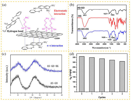 There are a large number of –OH and –NH2 in chitosan (CS), and these functional groups can combine with oxygen-containing groups on GO through hydrogen bonding or other interactions to improve the stability and functionality of the composites. Li et al. [67] successfully developed GO/CS composites (GCs) though the dropwise addition of GO hydrosol onto the surface of CS. The prepared adsorbent was used for simulated static adsorption of copper, lead, and cadmium ions in 50 mg·L−1 simulated wastewater. Sherlala et al. [68] prepared CS magnetic GO nanocomposites (CMGO) by using a chemical coprecipitation method, and they studied their adsorption properties for removing arsenic from water.