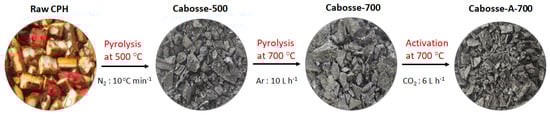 Three samples were prepared for evaluation and comparison: Cabosse-500 and Cabosse-700, biochars pyrolyzed at 500 °C and 700 °C, respectively, and Cabosse-A-700, an activated biochar produced at 700 °C. These temperatures were selected based on the optimal temperature ranges for obtaining optimal textural properties [28,29]. Initially, raw CPH on a dry base underwent pyrolysis at 500 °C in an oxygen-limited environment to produce Cabosse-500 with a 63.3% mass loss (Figure 1). Prior to the experiment, the biomass basket underwent a 60 min purge with N2 at a flow rate of 13.2 g min−1 to create an inert atmosphere, preventing unwanted reactions like oxidation during high-temperature treatment. Then, the furnace temperature was raised at a rate of 10 °C min−1 until reaching the desired pyrolysis temperature of 500 °C, which was maintained for 60 min. This pyrolysis was conducted at the University of Pau and Pays de l’Adour. Cabosse-500 was then subjected to a pyrolysis process at 700 °C in a cylindrical reactor at the Université de Haute-Alsace. The reactor tube was purged with Argon for 30 min and then heated to 700 °C at a rate of 10 L h−1 for 60 min to obtain Cabosse-700 with a mass loss of 26.33%. The choice of two different protective gases was due to the resources and protocols available at each laboratory. After several attempts, an activation of Cabosse-700 with CO2 at a temperature of 700 °C for 1 h at a CO2 flow rate of 6 L h−1 yielded Cabosse-A-700, with a mass loss of 8.6% (more information in Appendix A.2).