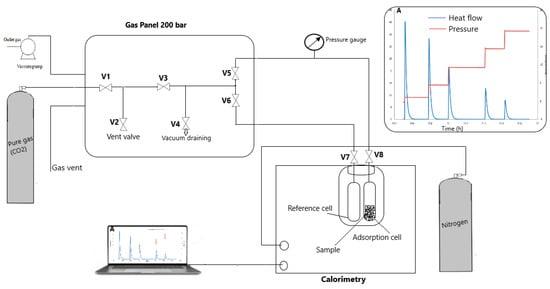 The heat of CO2 adsorption into the biochars and activated biochar was determined using a high-pressure differential scanning calorimeter, specifically the micro DSC VII from Setaram. The calorimeter block consists of two gas-tight high-pressure cells, the adsorption and reference cells (Figure 2), both made of stainless steel with a volume of 1 cm3. Samples of approximately 70 mg are carefully weighed before placement into the measurement cell. To remove any residual fluids in the system, a regeneration process is performed, which involves subjecting the sample to vacuum (10−2 Pa) through the gas panel and heating at 373 K for 24 h. Subsequently, the furnace, including both cells, is cooled from 373 K to 303 K at a rate of 1 K min−1. The system is stabilized at 303 K throughout the adsorption process to ensure uniform temperature distribution and heat flow signal stabilization. Then, a quantity of pure CO2 is introduced and regulated through the gas panel until the pressure in the system is stabilized, as previously described by Abou Alfa et al. [31].
