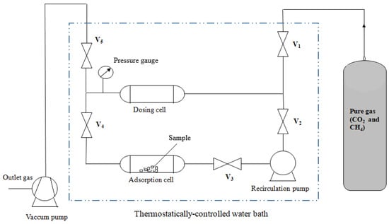 The apparatus used to obtain the pure gas adsorption isotherms is a homemade high-pressure manometric setup represented schematically in Figure 3. The procedure steps were already published [32,33] and are presented in Appendix A.3. The adsorption capacities of gases were determined using equations presented in the literature [34].