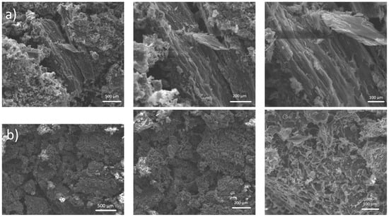The morphology of the CPH family, Cabosse-700 and Cabosse-A-700, was analyzed using SEM at different magnification scales (500 μm, 200 μm, and 100 μm) (see Figure 4). There were significant differences in the morphological shape between the two samples; SEM images of Cabosse-700 (a) showed a rigid structure with the absence of pores. On the other hand, Cabosse-A-700 revealed a breakdown of the rigid structure, resulting in a more porous and textured surface. Although the BET offers indication of micropore formation, SEM indicates the formation of larger pores, macropores. Cabosse-A-700 exhibited a higher BET surface area of 97 m2 g−1 compared to Cabosse-700, which had a surface area of only 4 m2 g−1 (Table 1). Cabosse-A-700 exhibited many honey-combed pores distributed on the surface with more cracking and a higher presence of pores. Similar observations were shown in a study conducted on CPH by comparing SEM images of its pyrolysis and activation [38]. These characteristics of the AC suggest that gas molecules can diffuse better and lead to improved adsorption efficiency [39].
