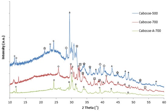 Regarding the oxygen content in the CPH family, Cabosse-500 has an oxygen level of 30.5 wt.%, which increases slightly to 33.1 wt.% in Cabosse-700; this could be due to the thermal decomposition of organic matter at higher pyrolysis temperatures, as confirmed by the TGA analysis (Table 1), which results in the formation or retention of oxygen-containing functional groups such as carbonyl and hydroxyl [18]. Interestingly, the oxygen level in Cabosse-A-700 (33.2 wt.%) is kept constant compared to Cabosse-700 (33.1 wt.%). Thus, the activation stage at 700 °C likely concentrates on eliminating volatile components without introducing additional oxygen groups. However, O might come from the inorganics (oxides carbonates, etc.), as sustained by XRD analysis (Figure 5). Their oxidation state/form can change during pyrolysis and activation, inducing different O contents.