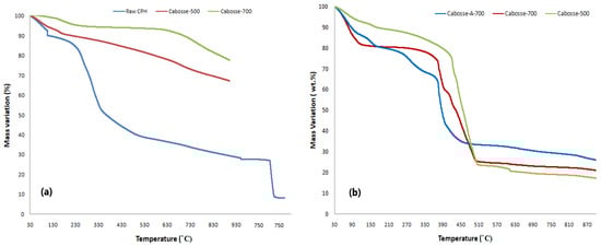 The conversion of CPH into biochar through pyrolysis and subsequent activation processes involves intricate changes in its moisture, volatile, fixed carbon, and ash content, along with changes in elemental composition, notably carbon and potassium levels. TGA profiles of the CPH family under N2 and air illustrate varying thermal stabilities (Figure 6), as indicated by Salgado et al. [46]. Pyrolysis at 500 °C results in a significant decrease in moisture from 10.1% to 6.6% and volatile content from 62.6% to 31.7% compared to raw CPH (Figure 6a). This reflects the thermal decomposition of organic matter and the removal of volatile compounds, along with an increase in fixed carbon content from 19.3% to 44.4% and ash content from 8% to 17.3% (Figure 6b). This high ash content is attributed to potassium levels in raw biomass (4.03% [22]). Conversely, pyrolysis at 700 °C leads to further decomposition of volatile organic compounds, reducing moisture (to 1.1%) and volatile content (to 21.3%), possibly due to carbohydrate breakdown at higher pyrolysis temperature [47,48], with an increase in fixed carbon content (to 56.7%). Higher pyrolysis temperatures enhance mineral concentration and destructive volatilization of lignocellulosic matter, explaining the increased ash content, as indicated by Tsai et al. [49]. These findings are consistent with previous research on biochar production from various biomass sources [50,51]. Cabosse-A-700 shows a notable increase in ash content, i.e., 26% compared to 20.9% in Cabosse-700, accompanied by a substantial increase in potassium content from 18% in pyrolyzed biochar to 35% in activated sample (EDX analysis in Table 1). This suggests the incorporation of potassium-rich compounds during activation, contributing to a higher ash content in Cabosse-A-700 compared to its pyrolyzed counterpart.