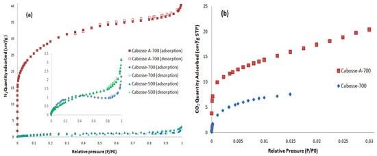 (a) Adsorption–desorption isotherm of cabosse family (, 77 K). (b) Adsorption isotherm of Cabosse-700 and Cabosse-A-700 (, 273 K).