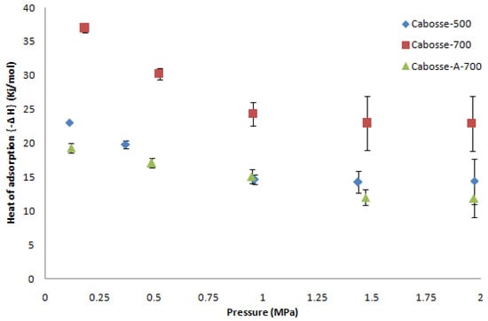 The differences in the heat of adsorption for the CPH family, Cabosse-500, Cabosse-700, and Cabossse-A-700, are attributed to the changes in their physical and chemical properties (Figure 8). This difference reflects the interaction strength between CO2 and the adsorbent surface. It was determined by integrating the findings of the CO2 adsorption isotherms under the pressure ranges and the calorimetry measurements of CO2 adsorption into the CPH family at 303 K as a function of pressure. The calculated heat of adsorption for the CPH family falls within the range of CO2 physisorption (<40 kJ mol−1), indicating a reversible adsorption mechanism [58]. The predominant adsorption interactions, primarily governed by physical mechanisms such as Van Der Waals forces, stem from the dipole–dipole interactions [59]. This heat of Cabosse-500, Cabosse-700, and Cabossse-A-700 decreases from 23.02 ± 0.01, 38 ± 1, and 19 ± 1 kJ mol−1 to 14 ± 3, 23 ± 4, and 12 ± 3 kJ mol−1, respectively, in a corresponding pressure range of 0.1–2 MPa. The highest heat for the CPH family is in the low-pressure range because gas molecules are more likely to be adsorbed onto accessible active sites on the adsorbent’s surface. As pressure rises, it begins to decrease, a common phenomenon in gas–solid adsorption systems because CO2 molecules compete more for the limited number of active sites, weakening the interactions between the samples and CO2 [60]. At very high pressure, the heat of adsorption reaches a plateau because most accessible adsorption sites are occupied. The same trend has been consistently observed in recent studies [61,62,63]. By comparing the heat of adsorption for the CPH family at 0.1 MPa, Cabosse-500 shows a lower value of 23.02 ± 0.01 kJ mol−1 than Cabosse-700 (38 ± 1 kJ mol−1), likely due to fewer active sites and lower oxygen content (Table 1). For Cabosse-700, there is an enhancement in the electrostatic interactions between CO2 and the surface oxygen groups. However, the heat value of Cabosse-A-700 (19.33 kJ mol−1) is lower than on the studied biochars, suggesting that the activation process likely increases the surface area and porosity and therefore increases the adsorption capacity of CO2 as confirmed by the adsorption isotherms (see Figure 9). Also, the elevated potassium content in this sample may increase competition for adsorption sites on the material’s surface, leading to weaker interactions between CO2 molecules and the surface and consequently a lower heat of adsorption. Cabosse-A-700 relies predominantly on physical adsorption mechanisms, such as Van der Waals forces, which enhance its efficiency for regeneration.