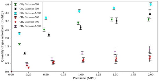 The CPH family, including Cabosse-500, Cabosse-700, and Cabosse-A-700, exhibits a higher affinity to CO2 compared to CH4 (Figure 9), primarily due to CO2 being a polar molecule which enables stronger interactions with the polar or charged sites on the surface of the CPH family. In contrast, CH4 relies on weaker Van Der Waals forces for adsorption [13,64]. Despite the poor structure of the pyrolyzed samples, their CO2 adsorption capacities (3.1 ± 0.1 for Cabosse-500 and 3.4 ± 0.3 for Cabosse-700) are higher than those obtained in other studies conducted on biochars, i.e., sawdust pyrolyzed at 450 and 750 °C (0.45 mol kg−1 and 1.03 mol kg−1, respectively, at 303 K) [65] and cotton wood pyrolyzed at 600 °C (1.31 mol kg−1 at 298 K) [66]. Cabosse-700 has been observed to improve CO2 adsorption compared to Cabosse-500; this improvement despite the absence of the micropores can be attributed to the development of specific surface sites and the increased quantity of oxygen functionalities as shown by the EDX results (Table 1). These oxygen groups promote hydrogen bonding between CO2 and the carbon surface.