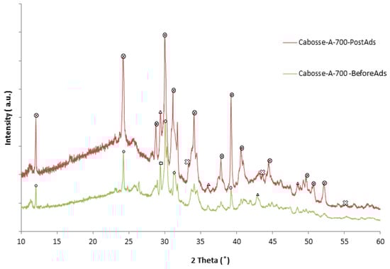 The elemental analysis by EDX, as shown in Table 1, indicated the presence of carbon (C), oxygen (O), and potassium (K) as the main elements, as well as minor elements such as calcium (Ca), magnesium (Mg), etc. The CPH family is rich in carbon and oxygen, typical for chars converted from agricultural residuals [40]. The increase in the carbonization temperature results in variations in the resulting biochar’s chemical composition, as confirmed by the literature [18,41]. Cabosse-500 exhibits a carbon content of 44.2 wt.%, which remains approximately constant after pyrolysis at 700 °C (44.1 wt.%) (Table 1). These findings suggest that the small difference in the pyrolysis temperature has a limited impact on the carbon content, and the volatile carbon was already removed after pyrolysis at 500 °C. However, a substantial reduction in carbon content to a value of 24.2 wt.% was observed in Cabosse-A-700. During this activation, the adsorbent experienced a mass loss of 8.6%, corresponding to a yield of 91.4%, meaning that 91.4% of the original Cabosse-700 material was retained after activation. The carbon content decreased from 44.1% in Cabosse-700 to 24.2% in Cabosse-A-700. Consequently, 50.1% of the original carbon content in Cabosse-700 was retained in Cabosse-A-700. This reduction in carbon content reflects the activation process, which oxidizes some of the carbon to enhance the material’s porosity and surface area. Despite the reduction in carbon, the high yield of 91.4% indicates that most of the original biomass was preserved, making Cabosse-A-700 an effective adsorbent with improved characteristics due to its activation.