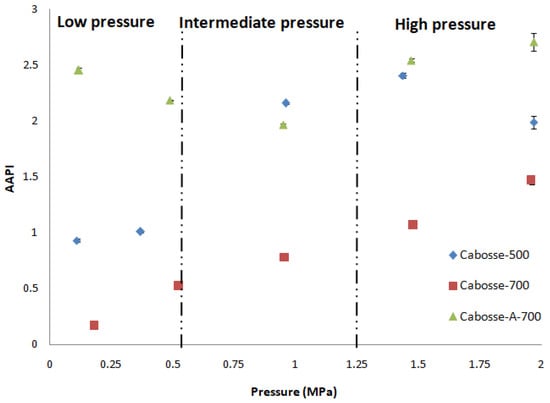 AAPI values of the cabosse family at 303 K as a function of pressure. Uncertainty calculated using the propagation of errors formula.