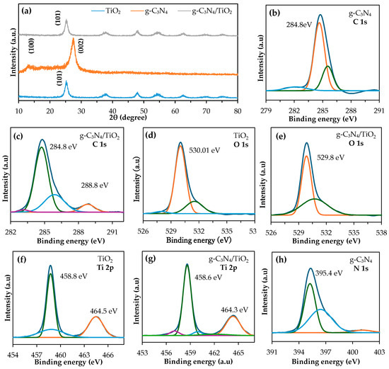 (a) XRD patterns and XPS high-resolution spectra. (b,c) C 1s, (d,e) O 1s, (f,g) Ti 2p and (h) N 1s of the studied photocatalysts.