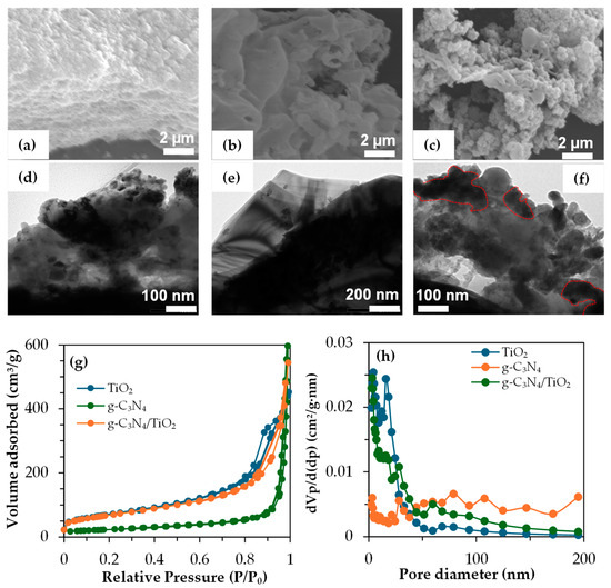 SEM and TEM images of (a,d) TiO2, (b,e) g-C3N4, and (c,f) g-C3N4/TiO2. (g) N2 adsorption–desorption isotherm and (h) corresponding pore-size distribution of TiO2, g-C3N4, and g-C3N4/TiO2.